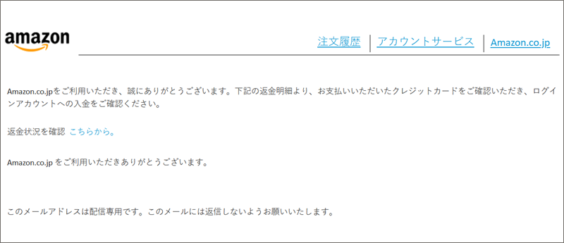 「ログインアカウントへの入金をご確認ください」とありますが、Amazon は通常「返金は◯日以内にクレジットカードへ反映されます」など、より具体的に記載されます。