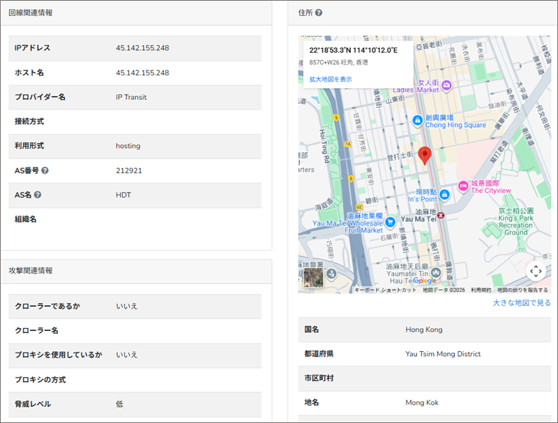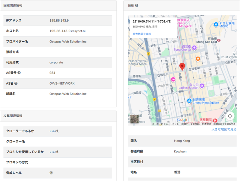 「IP調査兵団」でこのIPアドレスからそのロケーション地域を調べると、先程とは異なるものの再び香港・九龍の繁華街エリア付近であることが分かりました。