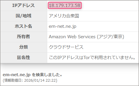 一応確認のため試しにドメイン「em-net.ne.jp」を割当てているIPアドレスとカッコ内のIPアドレスを比較してみましょう。