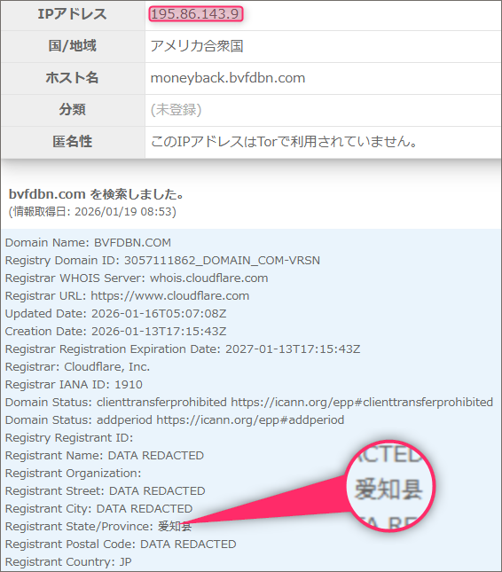 WHOIS情報を見ると、登録日Creation Date: 2026-01-13 で登録から数日しか経っていません。