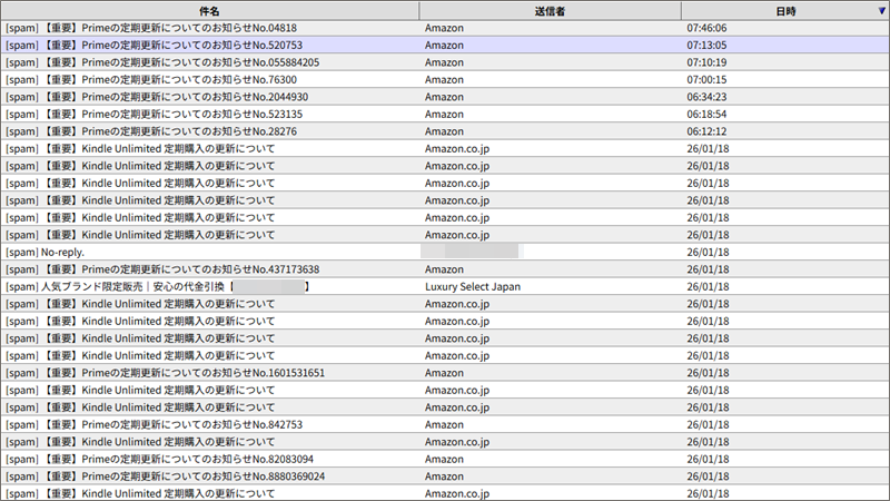 その半数近くがAmazonを騙るもので、なんと270通でそのほとんどの件名が「【重要】Primeの定期更新についてのお知らせ」でした。