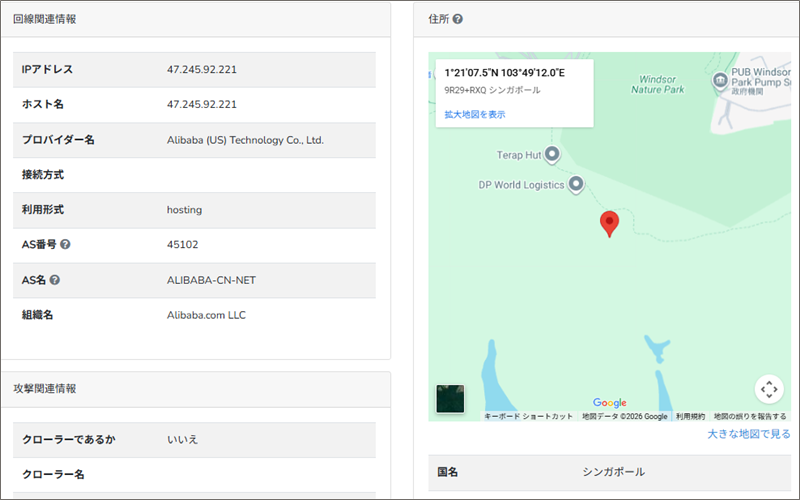 「IP調査兵団」でこのIPアドレスからそのロケーション地域を調べると、詐欺サイトではありがちなシンガポール山中であることが分かりました。