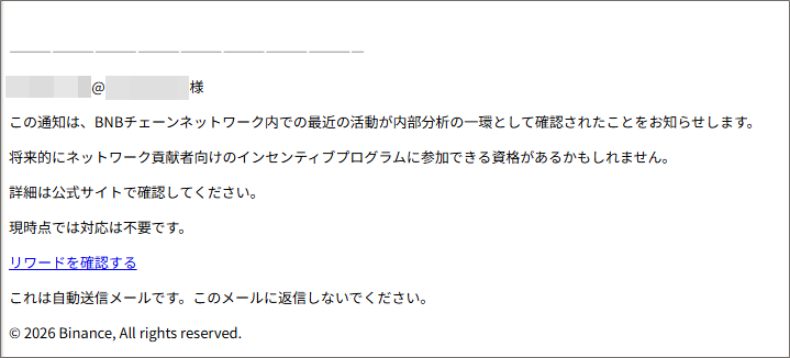 【危険】『BNBホルダーのネットワーク活動によるインセンティブのチャンス』メール、実例と見分け方