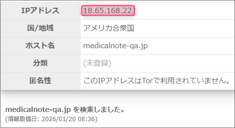 では、試しにドメイン「medicalnote-qa.jp」を割当てているIPアドレスとカッコ内のIPアドレスを比較してみましょう。