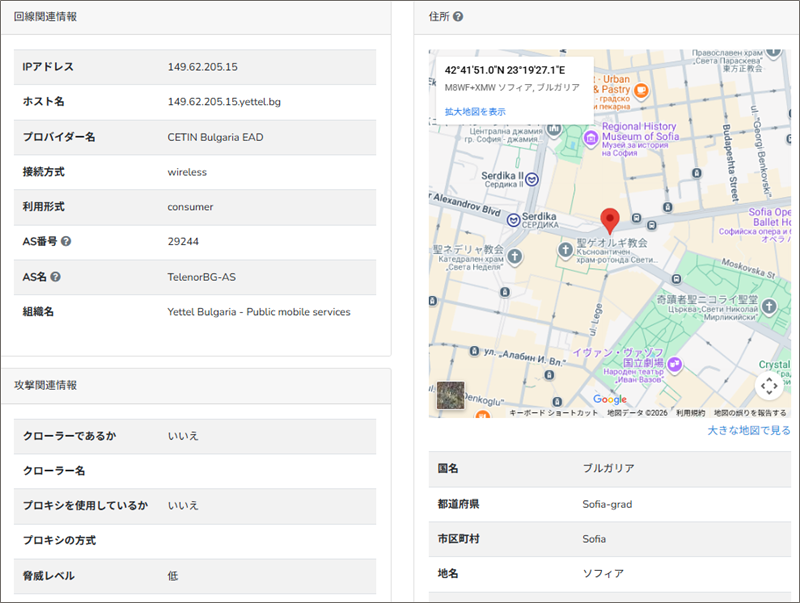 このReceivedフィールドの末尾にあるIPアドレスからメールの発信地を「IP調査兵団」で導き出してみると、ブルガリアのソフィア付近です。