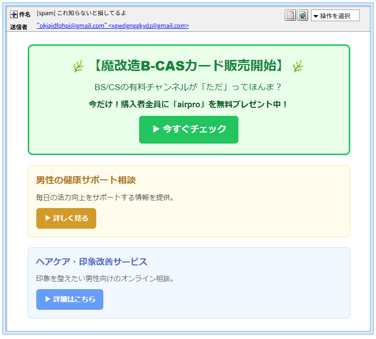 今回のメールは、最上部の「違法カード販売」というメインの目的を隠すかのように、下部に一般的な健康相談などの項目を並べ、あたかも正規のポータルサイトからの案内の体裁を装っています。