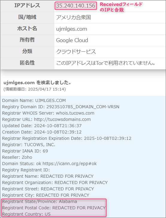 割当てているIPアドレスとReceivedフィールドのIPアドレスが合致したので、この送信者は自身のメールアドレスを偽ることなく何食わぬ顔でこのメールを送信してきたことになります。