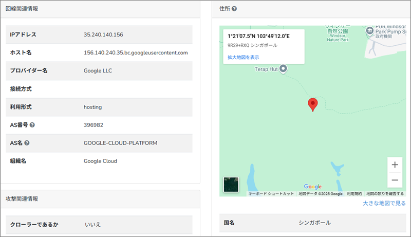 このReceivedフィールドの末尾にあるIPアドレスからメールの発信地を『IP調査兵団』で導き出してみると、シンガポールの山中です。