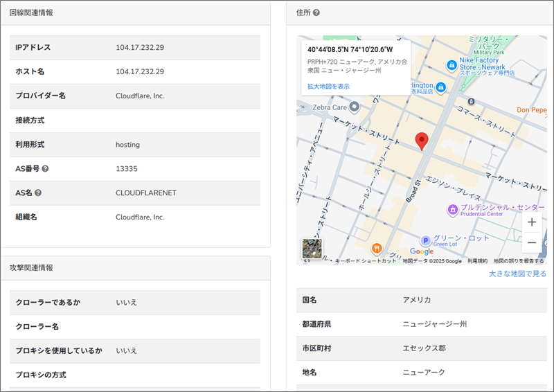 「IP調査兵団」でこのIPアドレスからそのロケーション地域を調べると、詐欺サイト設置場所は、米国ニュージャージー州ニューアーク付近であることが分かりました。