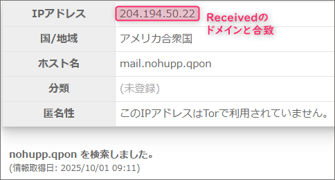 では、試しにドメイン「mail.nohupp.qpon」を割当てているIPアドレスとこのReceivedのIPアドレスを比較してみましょう。