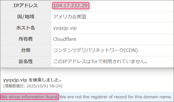 IPアドレスは取得できましたが、どうやらこちらでは持ち主などの詳しい情報は取得できませんでした。
