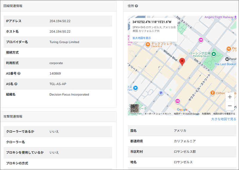 このReceivedフィールドの末尾にあるIPアドレスからメールの発信地を「IP調査兵団」で導き出してみると、ロサンゼルス付近です。