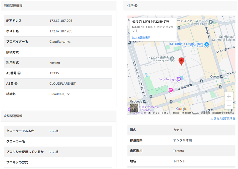 「IP調査兵団」でこのIPアドレスからそのロケーション地域を調べると、詐欺サイト設置場所は、カナダのトロント市庁舎付近であることが分かりました。
