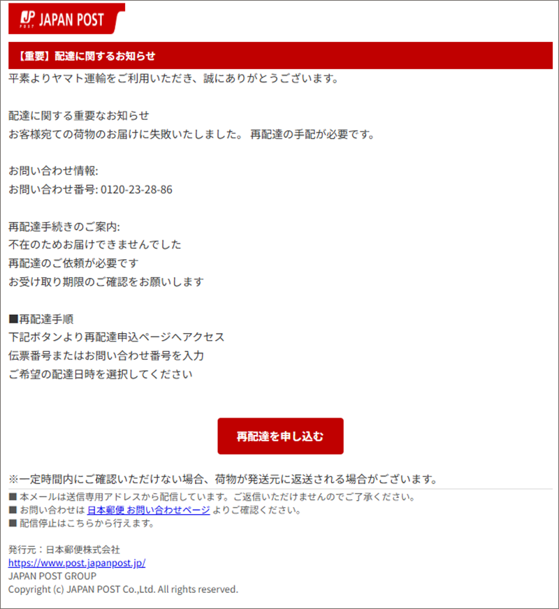 「こちら」へのリンク先が無いのはともかくとして、このような荷物の再配達に関するメールを配信停止にしても良いのですかね?