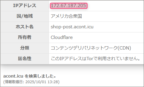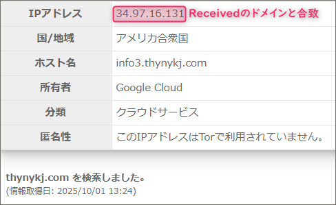 では、試しにドメイン「info3.thynykj.com」を割当てているIPアドレスとこのReceivedのIPアドレスを比較してみましょう。