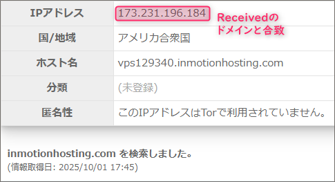 では、試しにドメイン「vps129340.inmotionhosting.com」を割当てているIPアドレスとこのReceivedのIPアドレスを比較してみましょう。