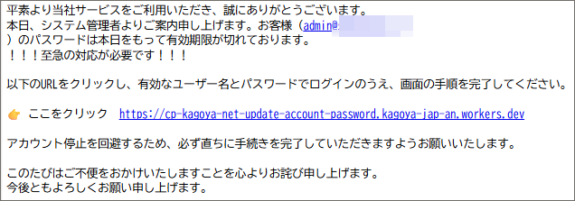 これはパスワードの期限切れを通達するメールですが、カゴヤ・ジャパンを名乗っていることからレンタルサーバーのアカウントに対するパスワードのことを言っているものと思われます。