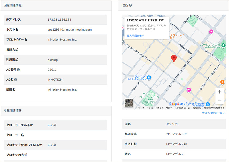 このReceivedフィールドの末尾にあるIPアドレスからメールの発信地を「IP調査兵団」で導き出してみると、ロサンゼルス付近です。