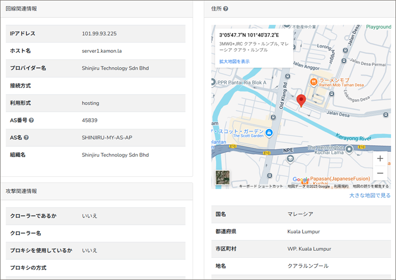 「IP調査兵団」でこのIPアドレスからそのロケーション地域を調べると、クアラルンプール付近であることが分かりました。