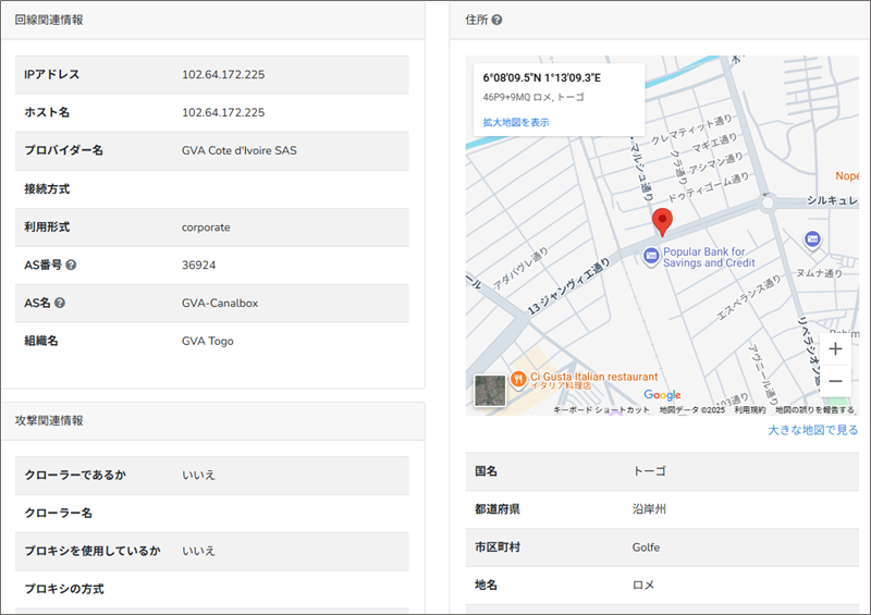 このReceivedフィールドの末尾にあるIPアドレスからメールの発信地を「IP調査兵団」で導き出してみると、西アフリカにあるトーゴ共和国の首都ロメ付近です。
