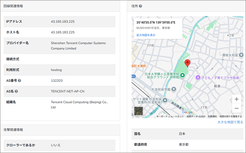 「IP調査兵団」でこのIPアドレスからそのロケーション地域を調べると、詐欺サイト設置場所は、東京都杉並区付近であることが分かりました。