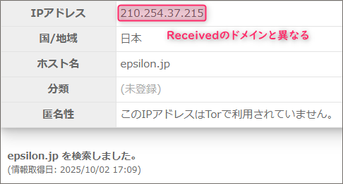 では、試しにドメイン「epsilon.jp」を割当てているIPアドレスとこのReceivedのIPアドレスを比較してみましょう。