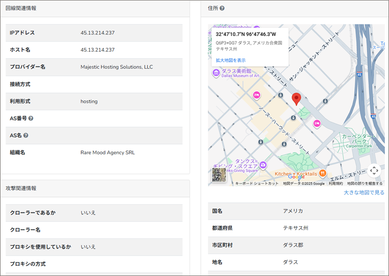 このReceivedフィールドの末尾にあるIPアドレスからメールの発信地を「IP調査兵団」で導き出してみると、米国のダラス付近です。