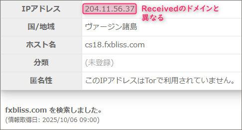ReceivedのIPアドレスと全然違いますよね、この結果からこの送信者が使ったとされる「cs18.fxbliss.com」を使ったメールアドレスは偽装であることが断定できます。