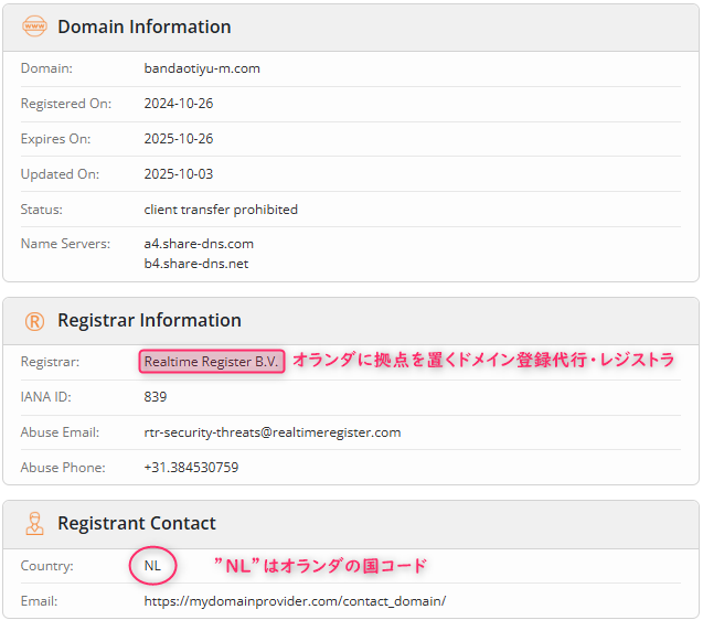 この情報が正しければ、このドメインの取得者の所在地はオランダで取得に利用したレジストラもオランダです。