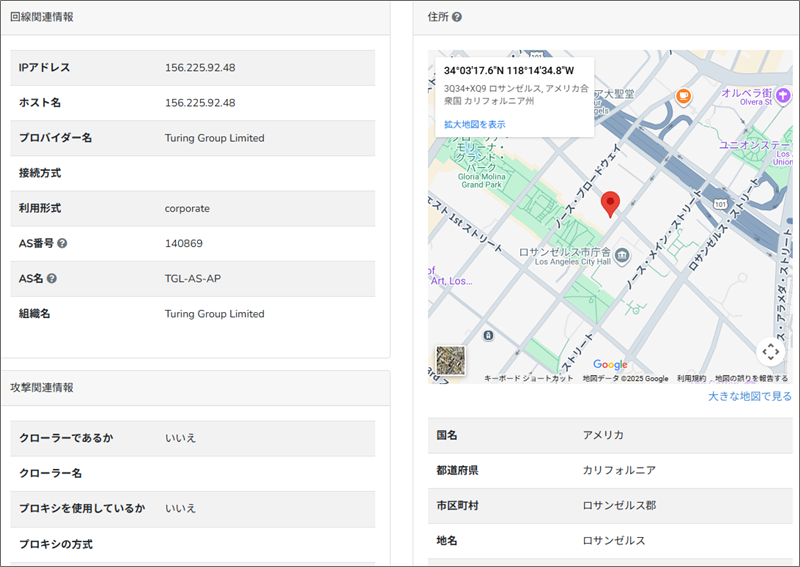 「IP調査兵団」でこのIPアドレスからそのロケーション地域を調べると、詐欺サイト設置場所は、ロサンゼルス市庁舎付近であることが分かりました。