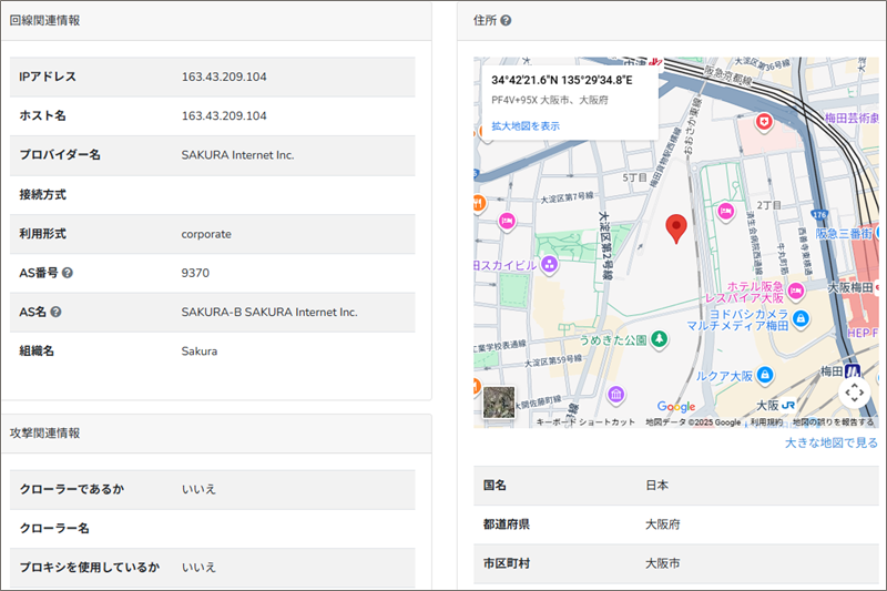 このReceivedフィールドの末尾にあるIPアドレスからメールの発信地を「IP調査兵団」で導き出してみると、大阪市梅田付近です。