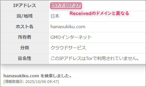では、試しにドメイン「hanasukiku.com」を割当てているIPアドレスとこのReceivedのIPアドレスを比較してみましょう。
