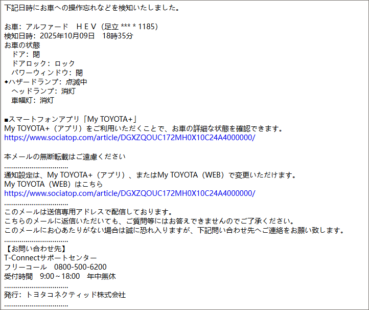 私もトヨタ車オーナーで、何度か窓の締め忘れでこの通知を受け取ったことがあるので、メールを見たときに「あっ!」と思ったのですが、車種がとナンバーが全く異なるので偽物からだとすぐに理解しました。