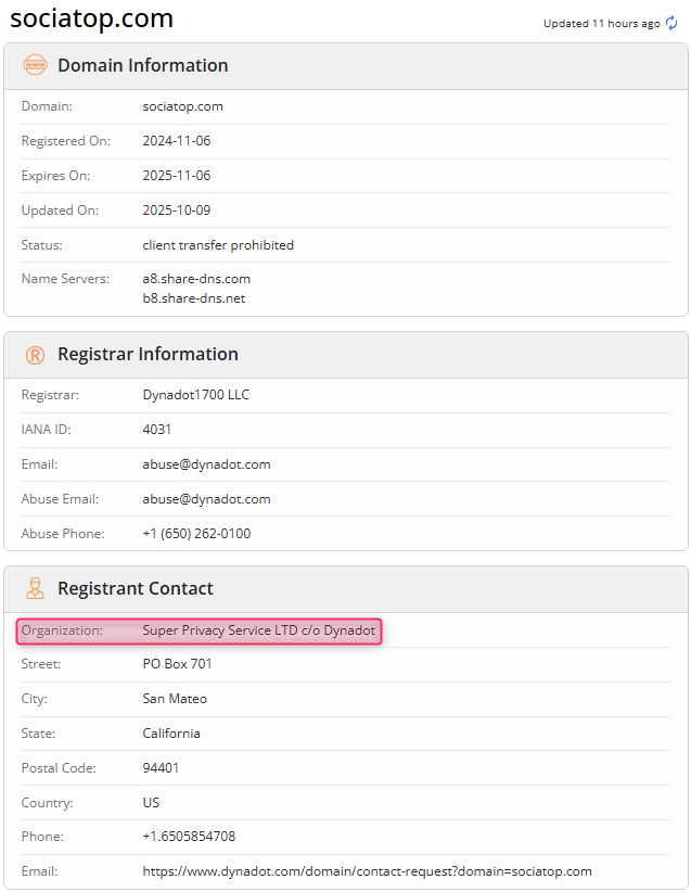 これは、米国のドメインレジストラ「Dynadot」が提供するドメインプライバシー保護サービスで、このサービスを利用すると、ドメインの登録者の各種情報(名前、住所、電話番号、メールアドレスなど)が公開されるのを防ぐため、その代わりにこのように、Super Privacy Service LTD c/o Dynadotの情報が表示され、スパムや不正アクセスからの保護が強化することができます。