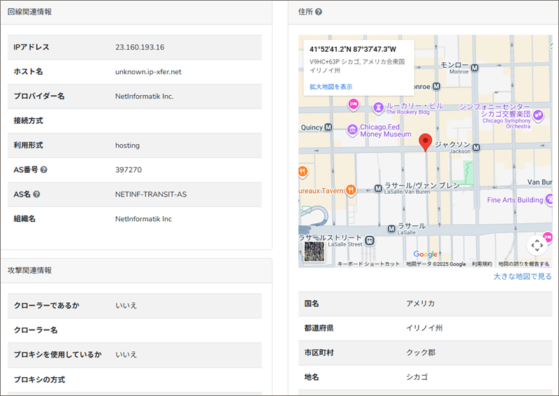 「IP調査兵団」でこのIPアドレスからそのロケーション地域を調べると、詐欺サイト設置場所は、米国のシカゴ付近であることが分かりました。