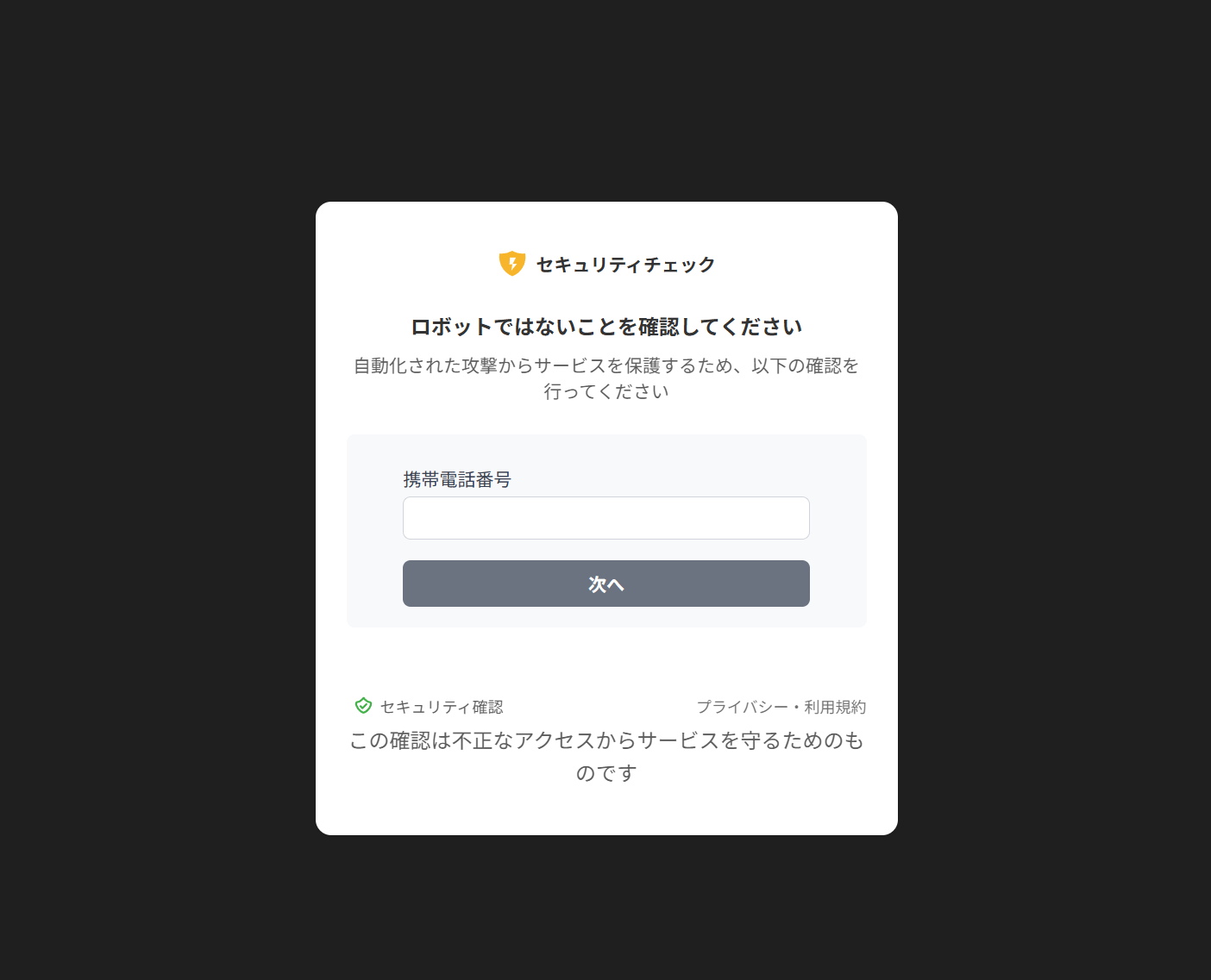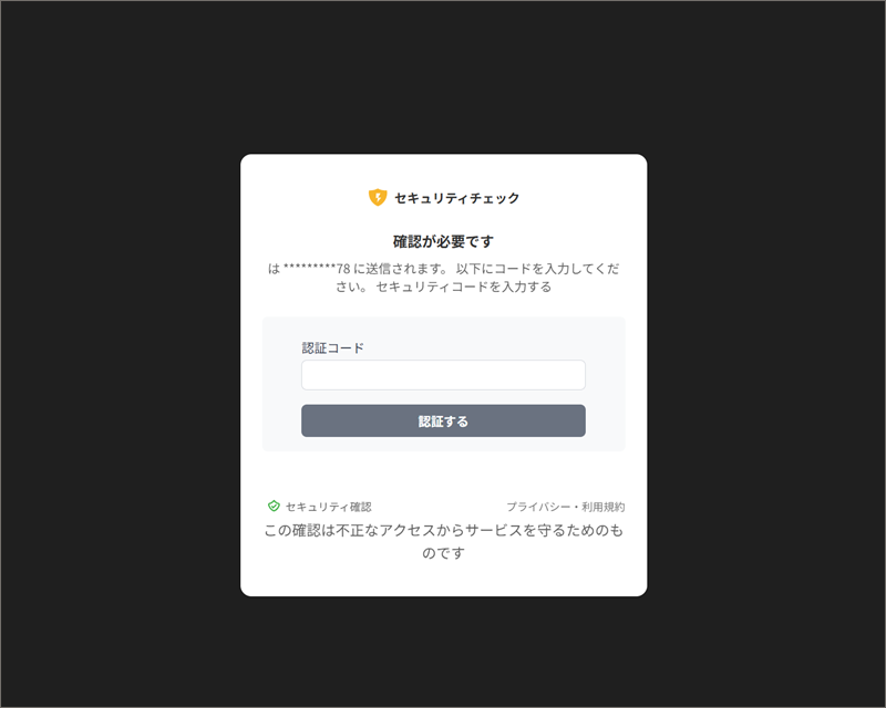 もちろん危険すぎるので偽の適当な電話番号で先に進むと、認証コードを求めてきました。
