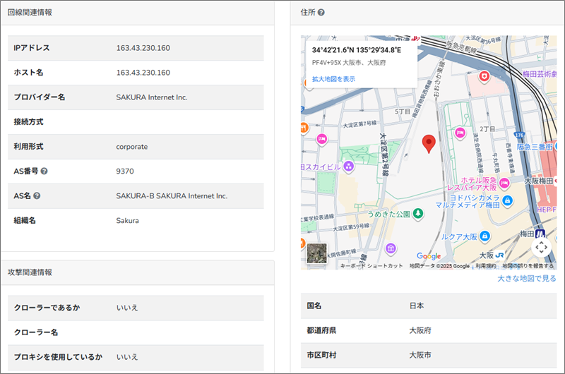 そしてプロバイダー欄からこのメールの送信者は、大阪市に拠点を置く大手ホスティングサービス「さくらインターネット」のユーザーであることが判明しました!