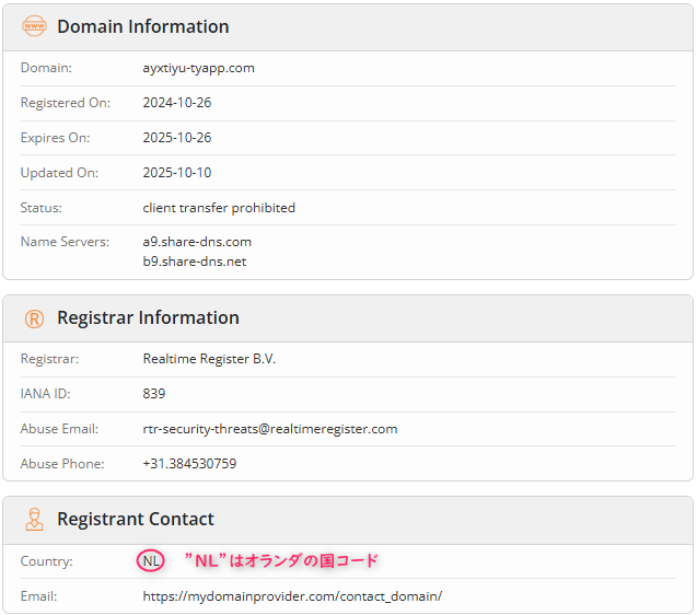 この情報が正しければ、このドメインの取得者の所在地はオランダです。