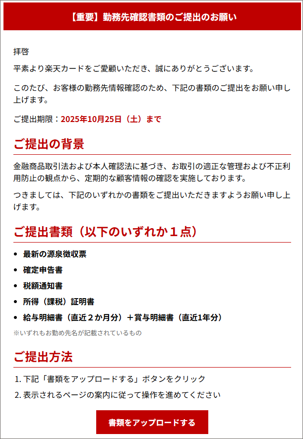 件名:[spam] 【期限間近】楽天カードより重要書類の提出について