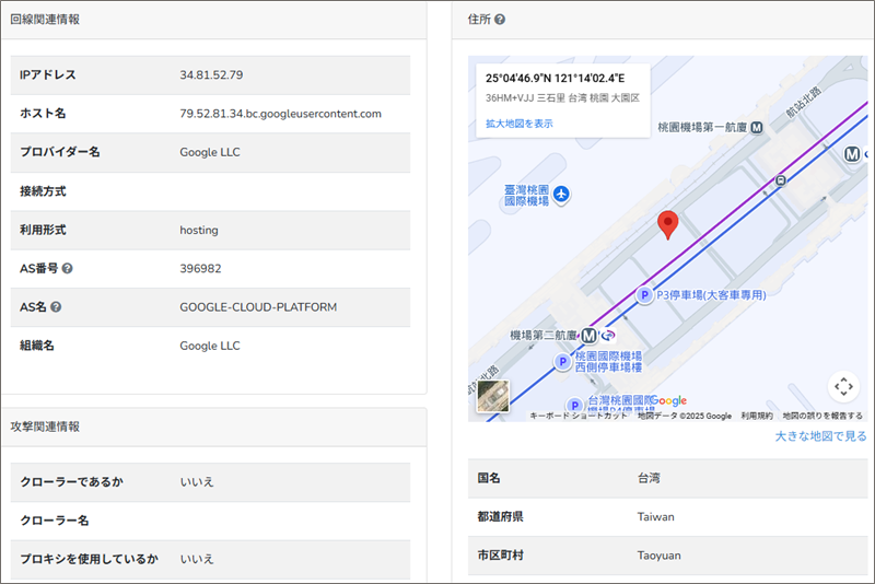 このReceivedフィールドの末尾にあるIPアドレスからメールの発信地を「IP調査兵団」で導き出してみると、台湾の桃園空港付近です。