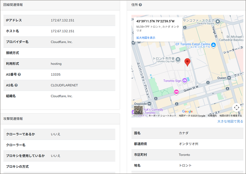 IP調査兵団」でこのIPアドレスからそのロケーション地域を調べると、詐欺サイト設置場所は、カナダのトロント市庁舎付近であることが分かりました。