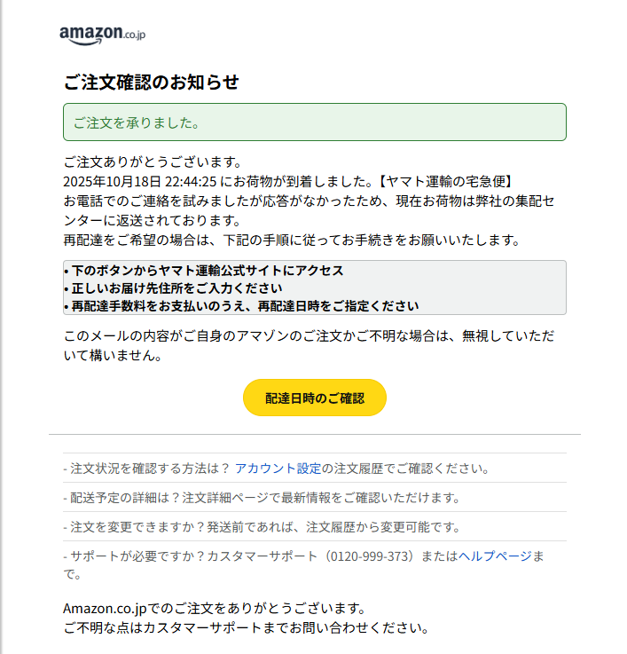 「ご注文確認のお知らせ」と書いてあるのに「2025年10月18日 22:44:25 にお荷物が到着しました」と。