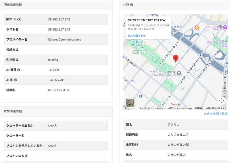 このReceivedフィールドの末尾にあるIPアドレスからメールの発信地を「IP調査兵団」で導き出してみると、ロサンゼルス市庁舎付近です。