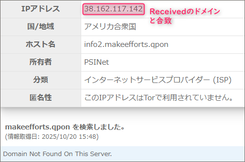 但し、割り当てているIPアドレスとReceivedフィールドのIPアドレスが合致したので、「info2.makeefforts.qpon」は、この送信者の本当のメールアドレスのドメインで間違いないようです。