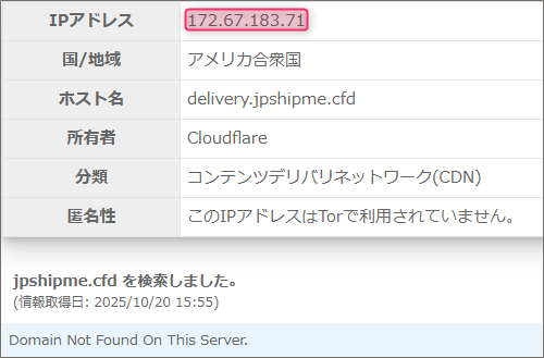 「Domain Not Found On This Server.」と書かれているので、このサーバーにはこのドメインに関する詳しい情報は存在しないようです。