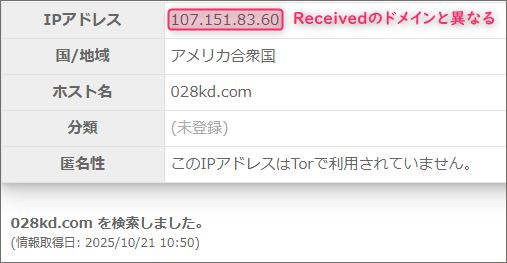 では、試しにドメイン「028kd.com」を割当てているIPアドレスとこのReceivedのIPアドレスを比較してみましょう。