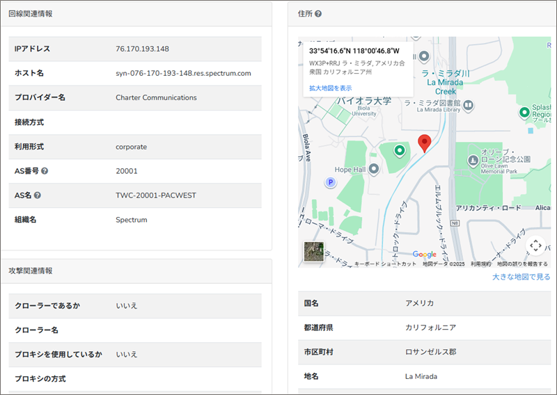 このReceivedフィールドの末尾にあるIPアドレスからメールの発信地を「IP調査兵団」で導き出してみると、カリフォルニア州のロサンゼルス郡にあるラ・ミラダ(La Mirada)付近です。
