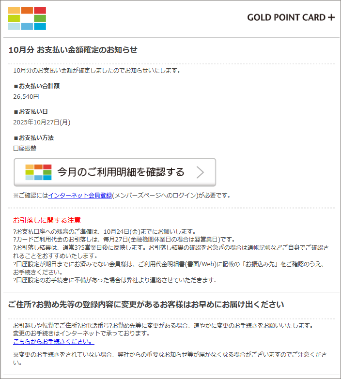 そんなカード会社から、毎月決まった日に「今月のご利用額」だとか「お支払額の確定金額」などと支払料金確認メールが届きます。