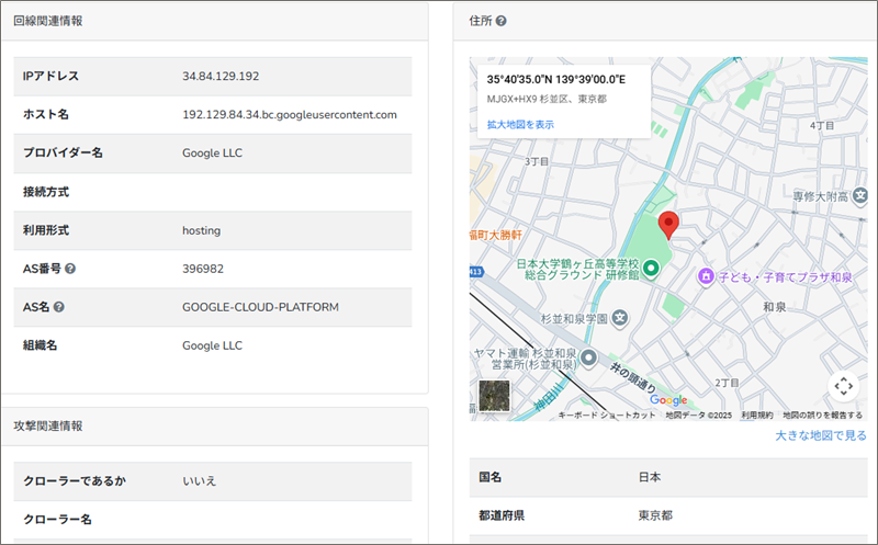 このReceivedフィールドの末尾にあるIPアドレスからメールの発信地を「IP調査兵団」で導き出してみると、東京都杉並区付近です。