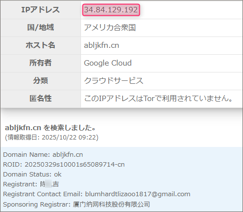 送信者として記載されているメールアドレスのドメイン(@より後ろ)は「abljkfn.cn」